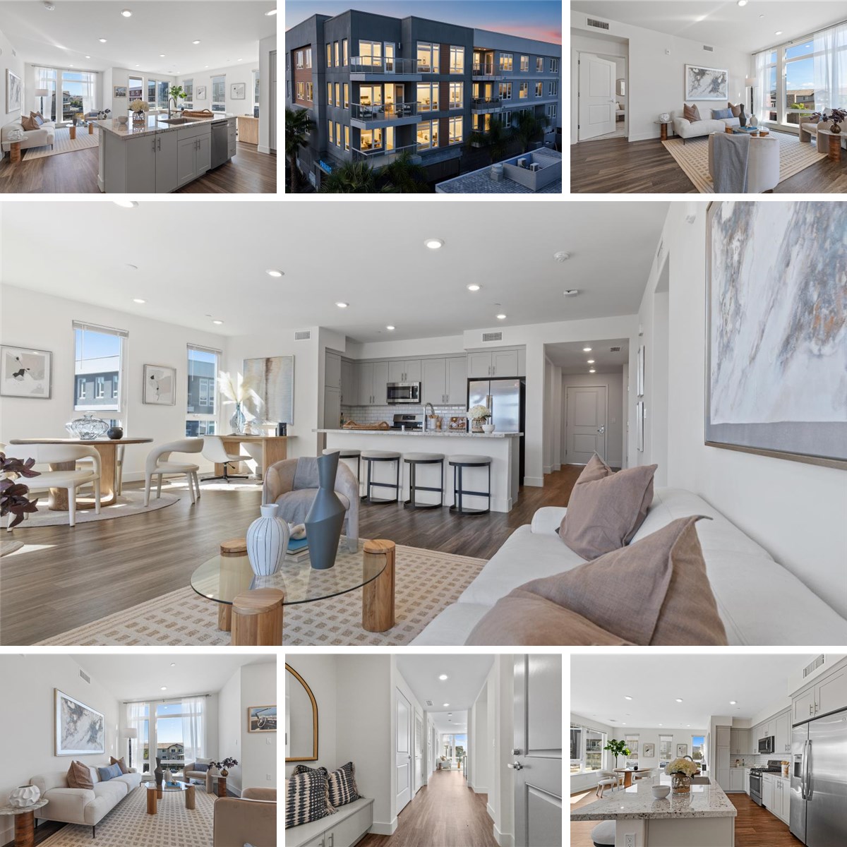 Sunlight fills the open-concept living area, connecting a gourmet kitchen with quartz countertops, stainless-steel appliances, and an oversized island — perfect for cooking, entertaining, or catching up over coffee. Step onto your private balcony to enjoy morning sun or evening sunsets over the hills.